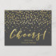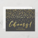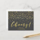 NewParkLane - Cartão-postal glamouroso, com 'Cheers' em tipografia elegante de pincel/ script em ouro falso, com confete dourado contra fundo de cinza escura. Diversão e design elegante para aniversários, casamentos e outras comemorações. Com um modelo de texto para o(s) seu(s) nome(s). Fácil de personalizar no Zazzle com seu próprio texto para um design personalizado. Os estilos de texto e a cor de fundo podem ser modificados para ajustado das suas necessidades. Verifique se há itens correspondentes nesta coleção. Você tem desejos pessoais específicos de design? Sinta-se livre para me contactar!