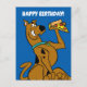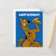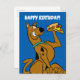 Veja Scooby-Doo sentado com um sorriso grande, segurando uma fatia de pizza de crosta recheada.