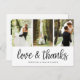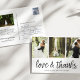 Um obrigado fotográfico moderno, que você postcard, desenhado para acomodar três das suas fotos favoritas de casamento alinhadas lado a lado. "Amor e obrigados" aparece na parte inferior em um roteiro de estilo manuscrito preto. Personalize com seus nomes e/ou data de casamento abaixo. Cartões postais inversos para mostrar seu endereço de devolução com espaço amplo para endereçamento do destinatário, bem como uma mensagem pré-impressa opcional e uma foto adicional. Se você preferir adicionar uma mensagem manuscrita, simplesmente exclua o texto de exemplo mostrado.