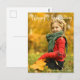 Cartão postal de foto de Ação de Graças feliz e elegante com tipografia cursiva bonita em branco sobre sua fotografia de outono. Este cartão dobrado de fotografia moderna da família outonal apresenta um roteiro lindo e seu nome em branco sobre a imagem da festa sazonal em bleed total.