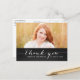 Cartões de agradecimentos de Graduação Russo do Script Branco Trendy. Design por Elke Clarke © Visite nosso compro www.zazzle.com/monogramgallery* para mais cores e estilos. Adicione sua própria foto e texto. Uma simples cobertura de texto de fonte de script manuscrito de tipografia branca em um fundo de quadro negro (efeito fotográfico impresso) com as palavras "Obrigado". Substitua a foto de exemplo por sua.