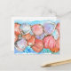 Um cartão-postal com tema de praia com camadas de conchas de moluscos desenhadas à mão com tinta sépia e pintadas com tons brilhantes de cor rosa-de-salmão e água-lavanda acentuadas com manchas de respingos e azul-turquesa como se estivesse entre as ondas.