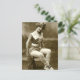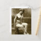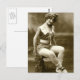 Fotografia vítrea de uma jovem no que poderia ser um traje de natação com grande cor branca e cinto. Ela tem um cachecol amarrado de forma estranha na cabeça. Ela tem saltos altos, meias enroladas e fitas escuras lacradas por seus calçados. Suas pernas estão cruzadas com joelhos