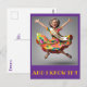 Sim Senhor!! Ela conseguiu!! A senhora está feliz porque está oficialmente aposentada, então ela está pulando alegremente e de agora em diante terá tempo para si mesma. Ela está usando um vestido colorido e brilhante que combina com os sapatos. O banner no peito dela lembra que ela acabou de conseguir. Cartão postal personalizável para parabenizar seu colega de trabalho querido.
