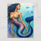 Este cartão-postal apresenta trabalho de arte de uma sereia de pele castanha com cabelos longos, azuis e roxos e rabo de peixe, posando em uma cena submarina com peixes, algas e corais. Os olhos dela estão fechados, pois ela serve peixe feroz! Estética do núcleo oceânico com uma garota negra bonito.