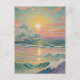 Uma pintura vibrante e tranquila de um pôr do sol sobre o oceano. O sol, uma brilhante órbita branca, está rodeado por um halo radiante de ouro que domina a metade superior da canvas. O céu é uma mistura de blues suaves, pinks e amarelos, com nuvens sábia pintadas em tons pastéis semelhantes. Abaixo, o oceano é uma cena dinâmica de quebrar ondas em uma lágrima profunda, com a água refletindo a luz ouro do sol. As ondas gentis rolam em uma margem arenosa, e a composição geral cria um senso de paz e beleza natural.