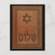 Apresenta uma "esculpida de madeira antiga" gerada por computador de uma Magen David (Estrela de David), texto lendo "Shalom" e uma borda floral.