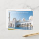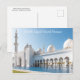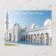 Cartão postal com uma fotografia da magnífica Mesquita Sheikh Zayed Grand em Abu Dhabi, Emirados Árabes Unidos, com a sua arquitetura moderna branca contrastada com um céu azul claro.