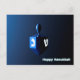 Um sonho modernista, azul metálico contra um fundo escuro e noturno. Duas das letras hebraicas encontradas num sonho, freira e brilho, brilham intensamente. O texto "Happy Hanukkah" também aparece em azul e branco brilhantes.