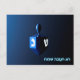Um sonho modernista, azul metálico contra um fundo escuro e noturno. Duas das letras hebraicas encontradas num sonho, freira e brilho, brilham intensamente. O texto hebraico que lê "Chag Chanukkah Sameach" (Feliz Chanucá) também aparece em azul e branco brilhantes.
