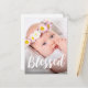 Cartão de agradecimento de batismo simples apresenta agradecimento bonito em letra branca em uma tipografia de pincel moderno com uma foto na frente, e uma mensagem de agradecimento personalizada e editável doce com cruz dourada e endereço de devolução no verso deste lindo cartão de agradecimento de ocasião religiosa.