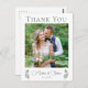 Um elegante roteiro de caligrafia verde com duas folhas de eucalipto pintadas à aguarela em ambos os lados na parte inferior para decorar este lindo cartão postal de agradecimento de fotografia de recém-casados para um casamento de outono. Um lindo cartão postal de agradecimento de casamento moderno à noite para uma ocasião de jardim com a fotografia do casal sob a tipografia simples e chic.