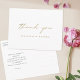 Verifique nossa coleção de cartões de agradecimentos simples e a coleção de cartões de agradecimentos dobrados para ver as versões deste cartão postal em outros formatos! Este simples obrigado de casamento elegante que você postcard mostra 'obrigado você' em um roteiro moderno chic. Este elemento do design não pode ser alterado. Você pode alterar a cor, a fonte ou o tamanho de qualquer outro texto. Escolhemos um tom chic às vezes chamado California Dourado como o padrão para o texto dos nomes na frente e a cor padrão do texto na parte traseira é um tom de cinza. Colocamos um exemplo de texto no verso para que você substitua por sua mensagem. Mas, por favor, não se sintam restringidos por isto. Se você preferir fazer o vazio traseiro para poder escrever uma nota manuscrita em cada cartão, você pode fazer isso. Em todo o caso, certifique-se de que eliminamos o nosso texto de amostra! Não escolhemos uma cor padrão para o plano de fundo em nenhum dos lados. Em vez disso, o padrão é definido como transparente para permitir que a cor do papel sirva simplesmente como tom base. Você pode alterar isso selecionando uma cor nas ferramentas de edição, se quiser por um ou ambos os lados. Um design minimalista como este coloca o papel num foco mais nítido e convida-o a adicionar as suas próprias palavras escritas à mão, sejam as suas assinaturas ou uma mensagem também. Escolhemos preferencialmentes mattas que semirbrilho como a opção padrão de papel, pois ele é adequado para escrevendo sua própria mensagem e não borrão. Mas você pode mudar isso de acordo com seu estilo. Use as ferramentas de edição intuitivas e faça com que este simples obrigado de casamento dourado moderno seja o único a fazer o seu cartão postal com as ferramentas intuitivas de design e a sua inspiração!