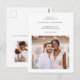 Simples e minimalista, dois casamentos de fotos preto e branco guardem o cartão postal com a tipografia clássica e uma foto na frente do cartão, com detalhes do site do casamento, uma segunda foto e o endereço de retorno da noiva e do noivo no verso do cartão postal do anúncio da data do casamento.