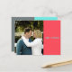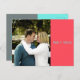 Este cartão postal de Save the Date é projetado de forma simples com blocos de cores coral, azul turquesa e cinza. Ele apresenta uma imagem na frente com nomes impressos sobre um bloco de cor coral. Os detalhes são indicados no verso sobre um bloco de cor cinza. Blocos de cores azul turquesa e cinza dividem o verso, sobrepostos com texto azul turquesa.