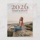 Anúncio de formatura com foto simples e sofisticado, apresentando o ano em uma fonte serifada grande com nome e escola abaixo sobrepostos à sua foto de retrato na frente. Design composto por Holiday Hearts Designs (direitos reservados). Fotos de modelo de espaço reservado cortesia Unsplash.