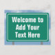 Sinal de autoestrada verde com Bem-vindo ao e seu nome comercial ou qualquer texto. Plano de fundo do céu azul para uma mensagem divertida ou para o marketing de negócios.