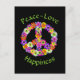 Este cartão-postal apresenta um sinal de paz floral em tons cor-de-rosa, amarelo, laranja, roxo, verde, branco e preto rodeados por "Paz, Amor, Felicidade".