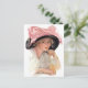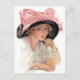 Jovem bebendo refrigerante enquanto veste um chapéu preto grande com arco rosa grande. Uma deliciosa cena vintage.