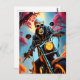 Um esqueleto a atravessar a caverna de fogo. a entrar no túnel encantado. Ele tem uma bicicleta saltada. Ele tem uma calça preta de couro e botas de motocicleta E uma jaqueta de couro preto com um design de emblema ósseo como um design na roupa de motociclista. Ele brilha eetéreo em seus arredores. Com a lua chegando atrás dele. Haze ascensão do fogo ao seu redor... na noite escura... ele se afasta com estrelas noturnas acima.