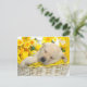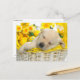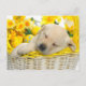 Cartão de animal mostrando um cachorro adorável esnozando em uma cesta de páscoa.