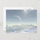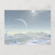 Ilustração de uma lua de gelo alienígena com um planeta anelar visível no céu.
