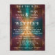 O elemento central do convite apresenta uma explosão estelar deslumbrante, radiando do centro numa mistura harmoniosa de tons azuis e ouros amarelos. O vibrante design capta o brilho das estrelas, com raios azuis brilhantes esticando-se para fora, fundindo-se suavemente com sotaques luminosos de ouro amarelo. Cada feixe de luz apaga elegantemente à medida que se estende, criando um brilho etéreo que dança através da página. Detalhes deliciosos e cintilantes são espalhados por toda parte, como estrelas minúsculas ou pontos de luz tipo diamante, melhorando a atmosfera radiante e festiva do convite. O efeito geral é mesmerizador e elegante, dando ao convite uma sensação celestial e celebratória.