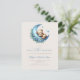 Este cartão-postal de convite para chá de fraldas de vassoura bonito apresenta um doce ursinho de água dormindo em uma lua crescente azul decorada com flores azuis, acima das palavras "sobre a lua" em roteiro de caligrafia azul. Personalize o texto com o nome da futura mãe no script e os detalhes na fonte sans serif em um fundo bege. Ideal para o chá de fraldas de um menino.