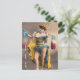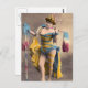 Fotografia vintage engraçada de uma mulher num leotard azul selvagem e listrado amarelo, fita amarela envolta em uma perna e acessórios brancos e azuis vermelhos