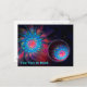 Uma imagem fractal, muito colorida e giratória aparece duas vezes. Uma vez sobreposta a um fundo espacial estrelado; uma segunda vez em uma esfera pequena cercada por uma aura brilhante. Talvez uma sonda lançada de uma nave-mãe, ou um ovo cósmico. Adicione seu próprio texto.