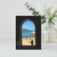 Cartão-postal de um homem está nas sombras de uma antiga autoestrada, olhando para uma bela praia em Cefalu, Sicília. Fotografia digital por Sue Melvin