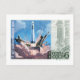 Imagem de artistas de um selo de correio soviético de 1972 representando o lançamento de um foguete Soyuz no espaço.