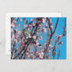 Um pardal com garganta amarela, sentado em galhos de cerejeira em floração. Brilhante céu azul ao fundo.