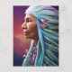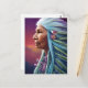 Belo cartão postal apresenta uma pintura digital gerada por IA de um velho espírito sereno como a mulher nativa americana em detalhes impressionantes, incluindo cabelo pastel e azul com flores e um fundo cor de laranja e púrpura.