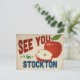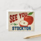 Um cartão postal encantador da viagens vintage Stockton California com uma adorável maçã vermelha, juntamente com um texto divertido no estilo retrô que diz, "Até em Stockton"