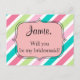As listras cor-de-rosa do arco-íris são a forma perfeita de convidar alguém para ser uma dama de honra para o seu casamento. Com um fundo listrado rosa, verde e azul, "Você será minha dama de honra" é personalizado dentro de um quadro rosa usando modelos personalizáveis. A parte de trás do cartão-postal é azul. Faça seu pedido hoje mesmo! Cartão postal design: WeddingsbyRhoadie Trabalho de arte criado por: AMBilustrações http://www.etsy.com/shop/AMBillustrations/ Quadro rosa: Prettygrafik design
