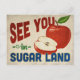 Um charmoso cartão-postal de viagem vintage de Sugar Land Texas com uma linda maçã vermelha, junto com um texto divertido em estilo retrô que diz "Vejo você em Sugar Land"