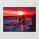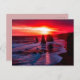 Decorar ou enviar um bilhete em estilo com este belo cartão postal de praia. Este design tem um incrível céu vermelho e laranja iluminando uma praia pacífica com grandes formações rochosas e cragas. Faz um presente ou decoração de excelente! Perfeito para o verão, praia, férias, oceano e amantes do sol/sol.
