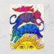 Dois pequenos gatos de mesa de tubby pulam sobre o Sol numa bela dança de solstício com um pássaro voando sobre o alto.
