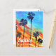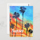 Praia do pôr do sol com palmeiras arte original de Sacha Grossel. A arte do tema da praia, sonhadora do pôr do sol vermelho e laranja no estilo original de aquarela. Tema do pôr do sol do surf.