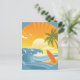 Design redonda de uma cena de praia com uma pequena ilha a esportar uma palmeira e uma ascensão de conselho surf da areia, rodeada por ondas azuis sob o sol. Este cartão postal é totalmente personalizável.