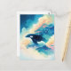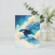 This breathtaking postcard features a majestic orca whale gliding surreally through a dreamlike atmosphere where the ocean meets the sky. The killer whale's sleek black and white body is speckled with shimmering stardust as it passes through a vibrant canopy of teal and deep blue celestial trees. Billowing clouds in soft peach, cream, and pale yellow tones create a sunset-inspired backdrop, while tiny white birds and glowing stars drift through the hazy air. The ethereal lighting and painterly textures give this piece a powerful sense of freedom and magical wonder. This postcard is an ideal choice for sending an inspirational message, a thoughtful "thinking of you" note, or for use as a stunning piece of surreal nature-inspired wall decor.