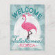 Tallahassee Florida rosa flamingo. No estilo de posters viagens vintage, diz "Bem-vindo a Tallahassee, Flórida" em turquesa verde rosa, branca e menta.