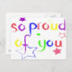 Cartaz bem desenhado pela Srta. T design. O cartão postal diz "Tão orgulhoso de ti." Avise a alguém o quão bem eles fizeram e o quão orgulhoso você realmente está. Projetado com cores brilhantes e efeito de giz.
