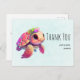 Cartão de agradecimento com uma ilustração fofa de uma tartaruga marinha. Corpo e casca rosa com um enfeite floral. Parece feliz e adorável.