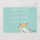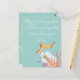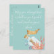 Cartão postal de tema de praia bonita com texto personalizável "que você sempre tenha uma concha no bolso e areia nos sapatos" em fonte branca de roteiro moderno, fundo azul e gráfico de vida marinha de mensagem em uma garrafa em aquarela