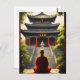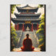 Testemunhem um momento de reflexão tranquila como um monge em vestes vermelhos senta-se em meditação antes de um templo tradicional chinês. A trabalho de arte detalhada mostra a atmosfera pacífica da cena, com um verde-luxuoso e uma escada gigante que leva à entrada do templo. Uma peça perfeita para qualquer pessoa que queira adicionar um toque de calma espiritual ao seu redor.