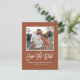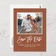 Anuncie sua data de casamento para a família e amigos com este cartão postal personalizável. Ele apresenta uma caligrafia ousada e uma simples tipografia. Personalize este terracota para salvar o cartão-postal, adicionando sua própria foto e detalhes do casamento. Esta foto para salvar o cartão-postal da data também está disponível em outras cores.