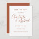 Apresentando nomes de estilo de assinatura, este elegante terracotta salva o cartão de data pode ser personalizado com seus detalhes de evento especial na tipografia do terracotta moderna. Projetado por Thisnotme©