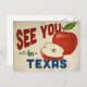 Um cartão postal encantador da viagens vintage do Texas com uma adorável maçã vermelha, juntamente com um texto divertido no estilo retrô que diz, "Venham no Texas"